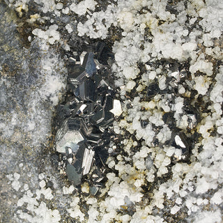 - Calcita con galena, boulangerita y tetraedrita: El brillo metálico de estos minerales añade un contraste visual único con la calcita. La galena, con su brillo plomizo, y la boulangerita, con sus tonos grisáceos, crean combinaciones llamativas y singulares.