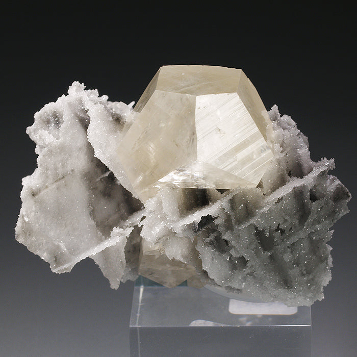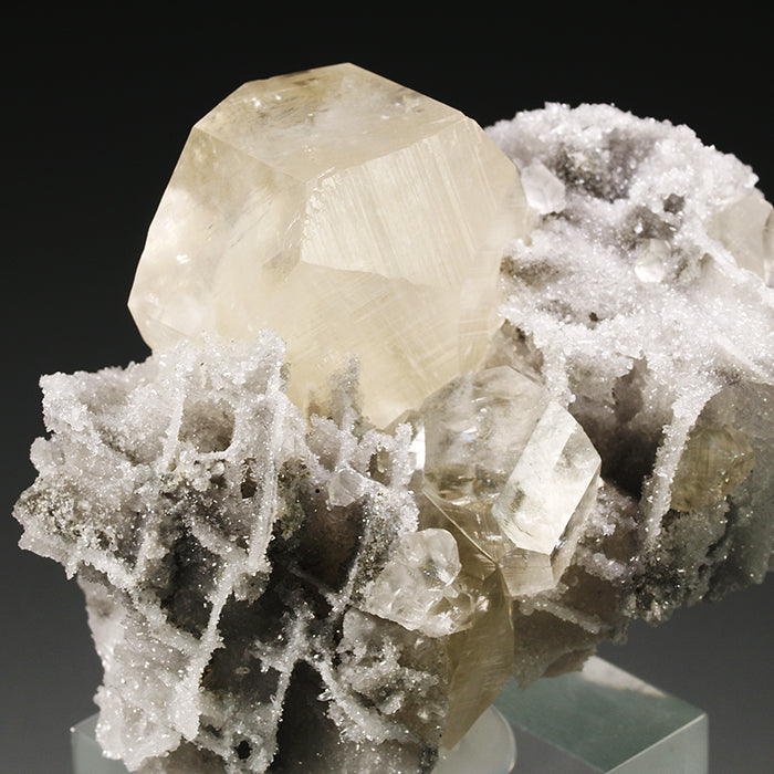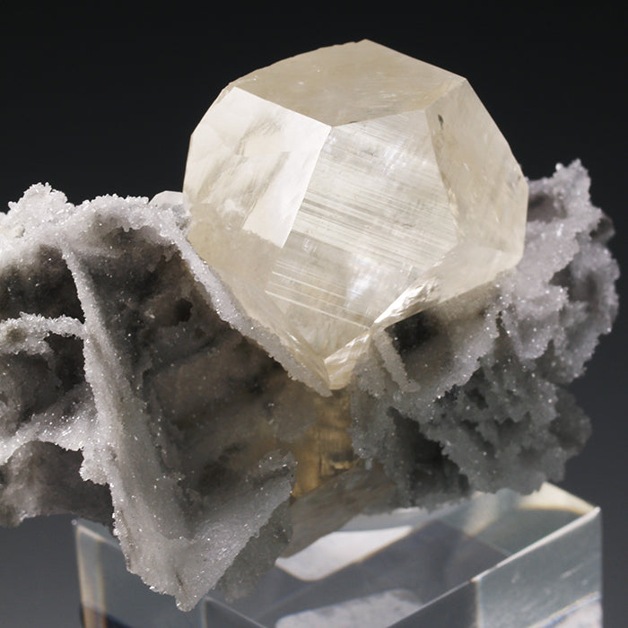 Un ejemplar de calcita muy estético y además interesante a nivel cristalográfico, ya que podemos observar perfectamente las caras romboédricas con estriaciones truncando al prisma hexagonal. El cristal es translúcido a transparente y se dispone sobre una matriz oquerosa formada por pequeños cristales de cuarzo.