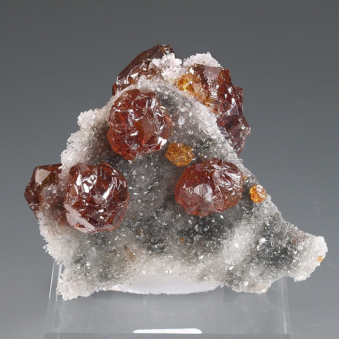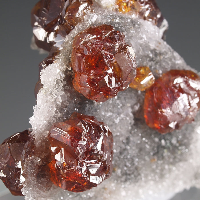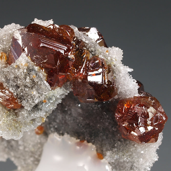 Estos clásicos ejemplares de esta localidad son cada vez más difíciles de encontrar. Se trata de grupos de cristales de esfalerita, muy complejos a la vez que muy facetados, con un excelente brillo y transparencia, lo que nos permite ver este color melado cuando la luz incide en ellos.