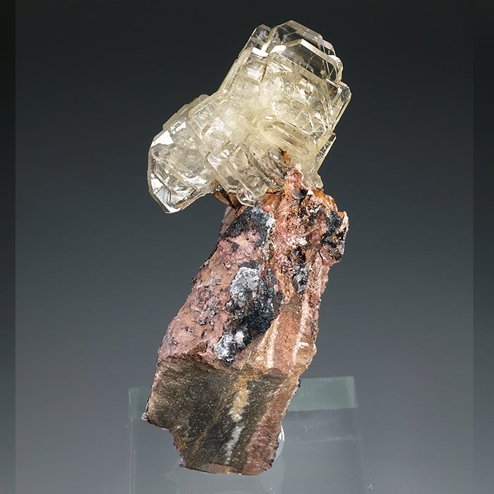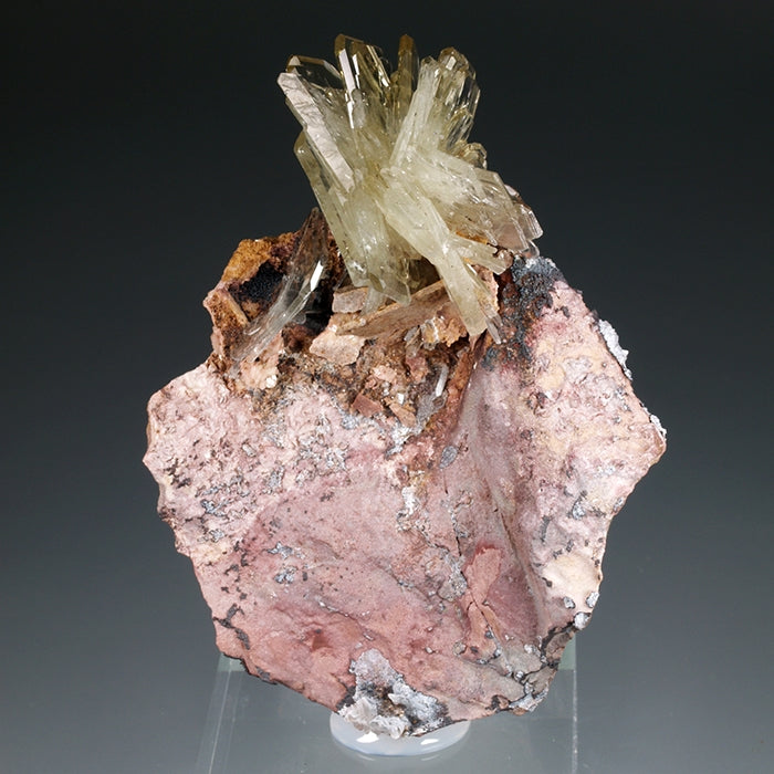 Los cristales de barita de Cerro Warihuyn son un clásico de la mineralogía peruana. Estos ejemplares nos muestran nutridos grupos de cristales tabulares, definidos por caras pinacoidales desarrolladas que truncan las de los prismas, dando al ejemplar una estética poco habitual entre las baritas. Transparentes, brillantes, con un ligero color amarillento y formando crecimientos paralelos y en libro e interpenetrados. Muy fluorescentes bajo la luz UV (OC-OL) con emisión de luz amarilla. Un clásico con estética para vitrina. Cristal mayor: 2,5 x 1,6 x 0,3 cm.