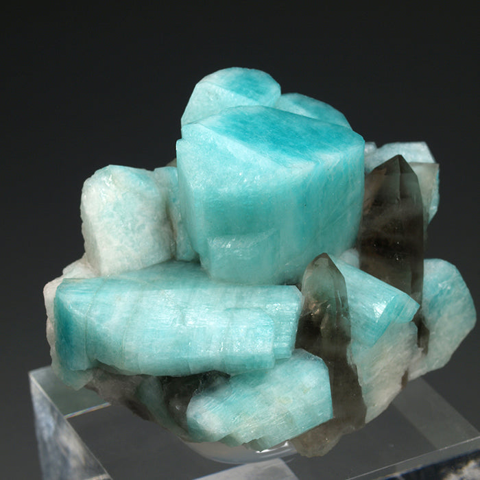 Muy estético ejemplar formado por un nutrido grupo de cristales de microclina, variedad amazonita, con caras y aristas muy definidas y con un color azul muy atractivo y característico. Se acompañan de varios cristales de cuarzo ahumado con transparencia. Estos ejemplares son un clásico de la mineralogía norteamericana.