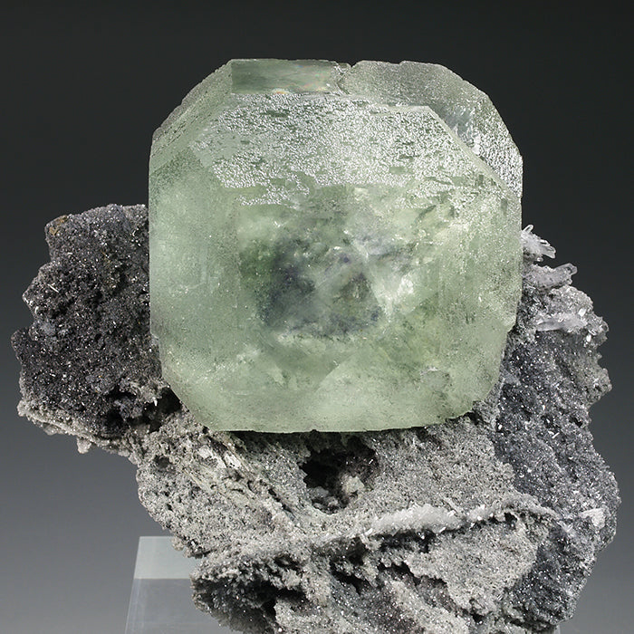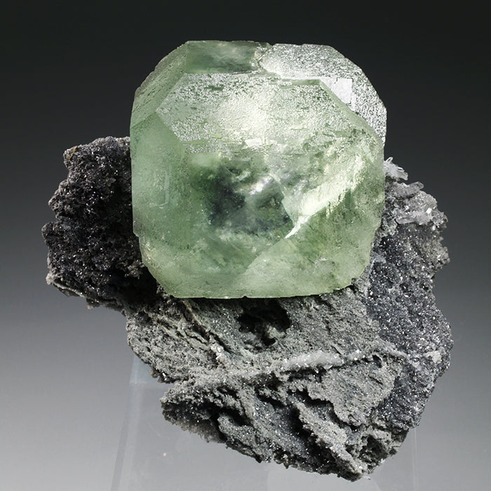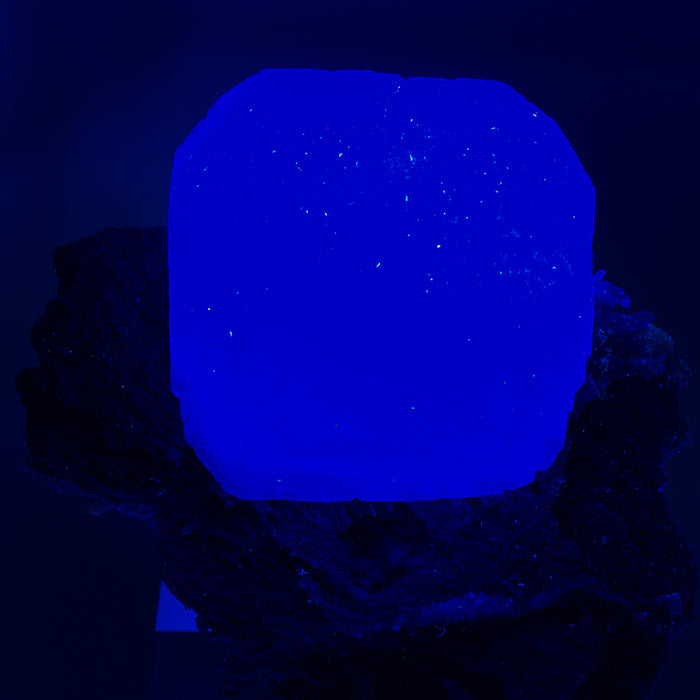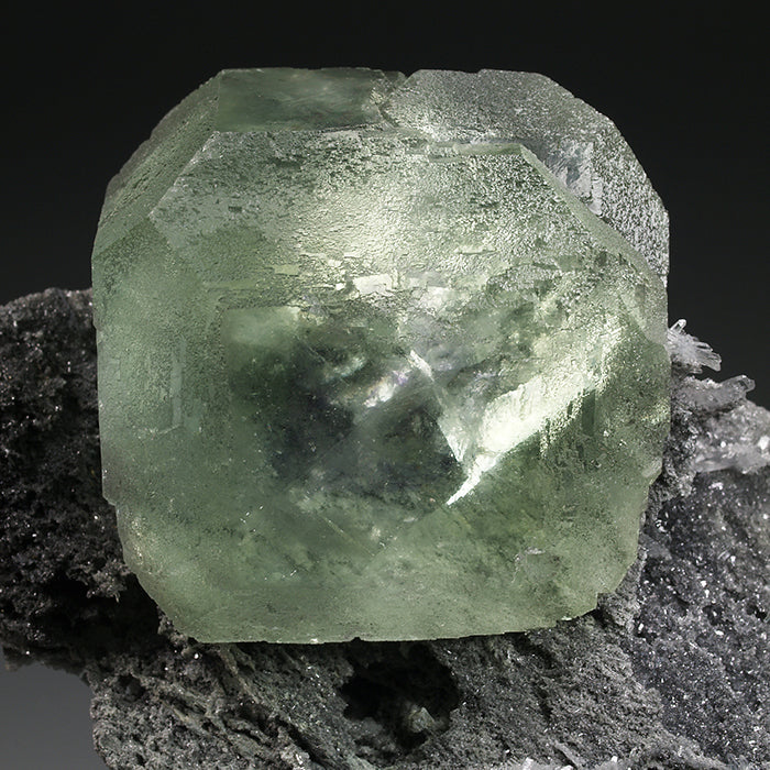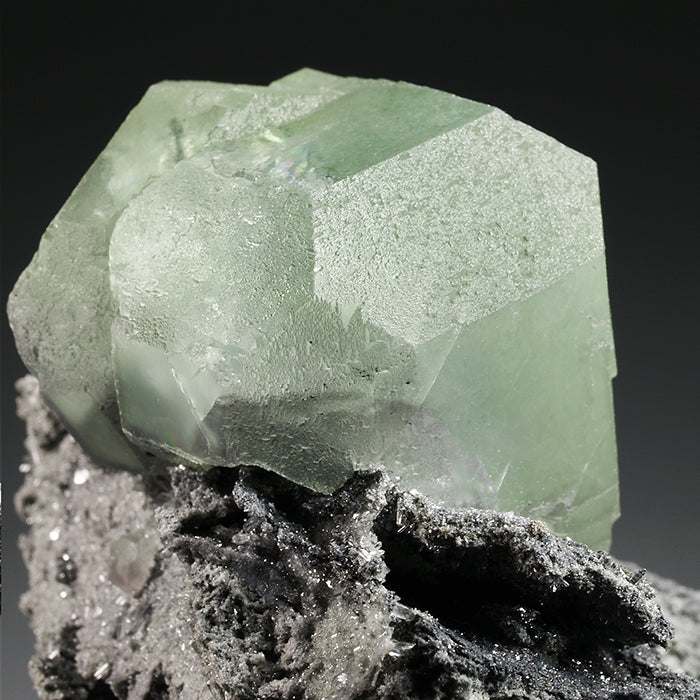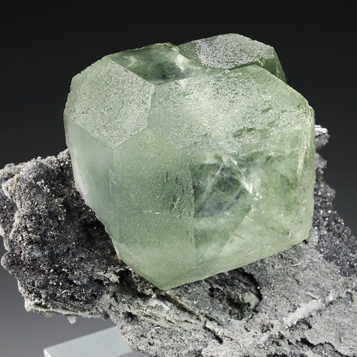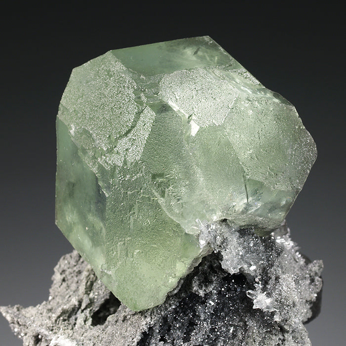 Grupo de cristales de fluorita, de muy buen tamaño, uno de ellos predominante y que forma la parte frontal de la pieza. Se trata de cristales cúbicos con las aristas biseladas por el dodecaedro. La transparencia es muy buena y nos permite ver un color verde ciertamente uniforme e incluso las inclusiones de la matriz. Fluorescente bajo la luz ultravioleta. Un espécimen muy atractivo para los coleccionistas de fluorita.