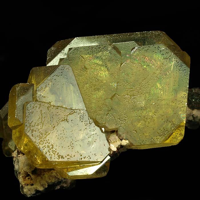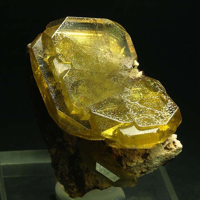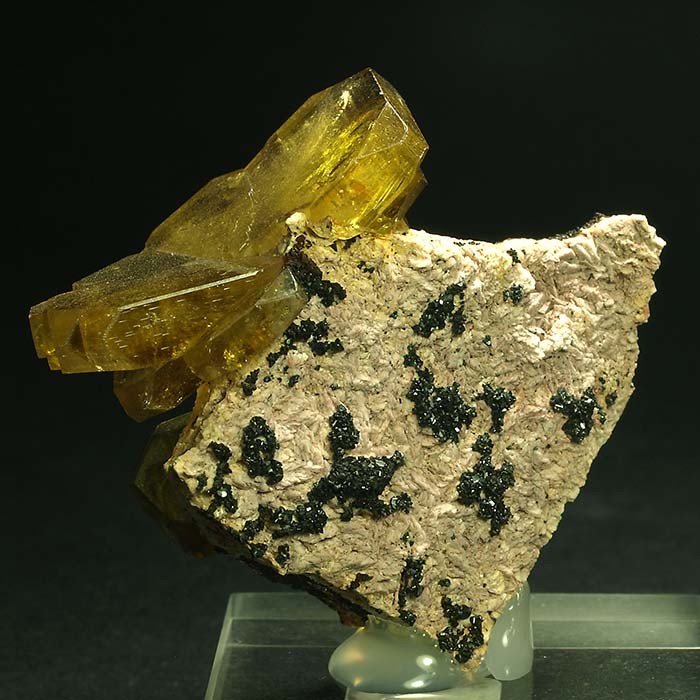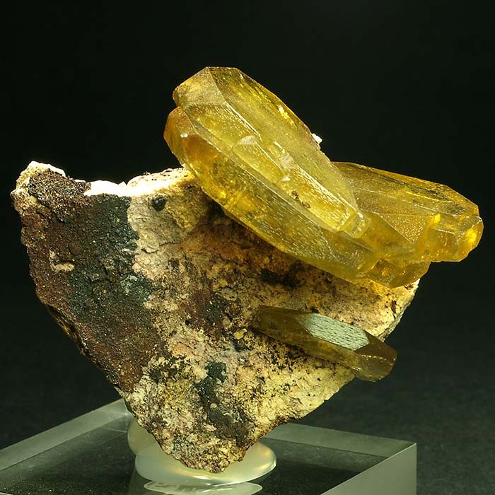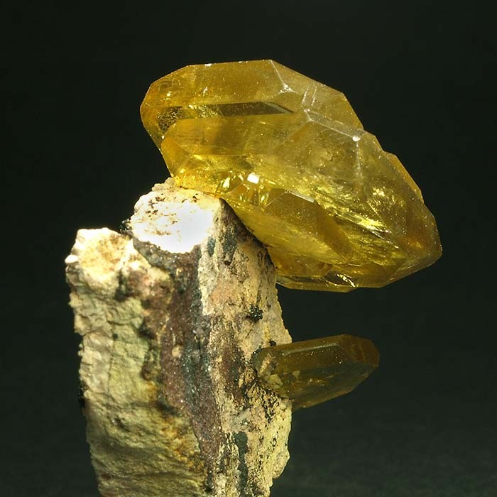 Como una mariposa posada sobre la matriz podemos disfrutar de estos cristales tabulares de barita de este clásico yacimiento. Intenso color amarillo, transparencia y una disposición impecable. Buscando la diferencia. CRISTAL MAYOR: 2.5 x 2 x 0.4 cm.