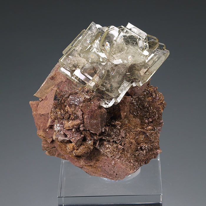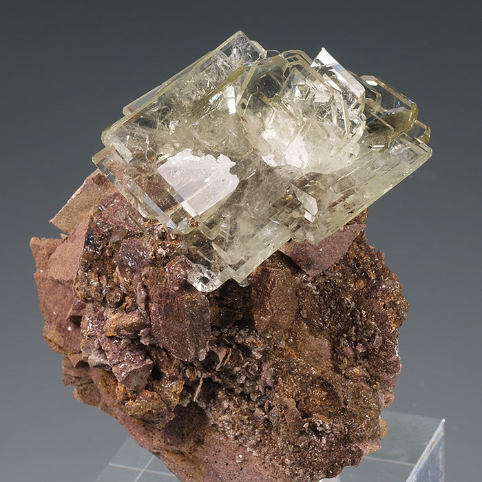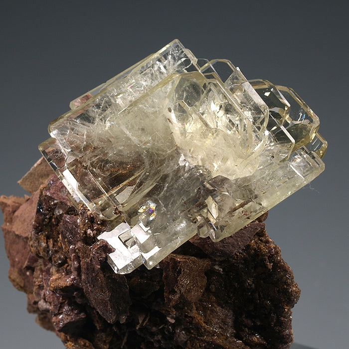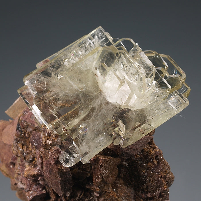 Los cristales de barita de Cerro Warihuyn son un clásico de la mineralogía peruana. Estos ejemplares nos muestran nutridos grupos de cristales tabulares, definidos por caras pinacoidales desarrolladas que truncan las de los prismas, dando al ejemplar una estética poco habitual entre las baritas. Transparentes, brillantes, con un ligero color amarillento y formando crecimientos paralelos y en libro e interpenetrados. Muy fluorescentes bajo la luz UV (OC-OL) con emisión de luz amarilla. Un clásico con estética para vitrina. Cristal mayor: 2,3 x 1 cm.