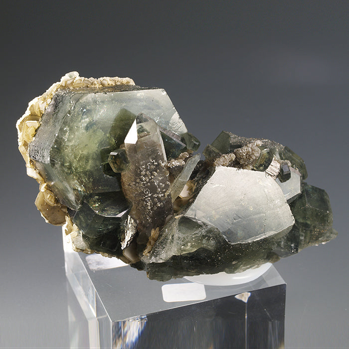 Grupo de cristales de fluorapatito de muy buen tamaño, con el prisma hexagonal muy bien definido y truncado por caras pinacoidales; con brillo y transparencia, lo que nos permite ver una marcada zonación geométrica de color. Para darle un toque aún más estético podemos observar un cristal de cuarzo hialino salpicado por pequeños cristales de siderita y moscovita. Se acompañan en la matriz con arsenopirita y calcita. El cristal de fluorapatito principal es de un tamaño más que considerable incluso para esta clásica mina portuguesa.
