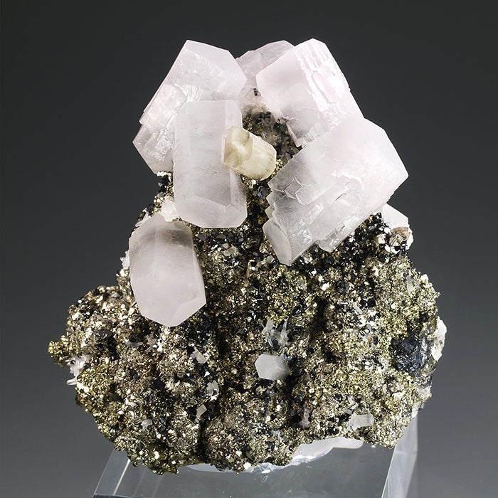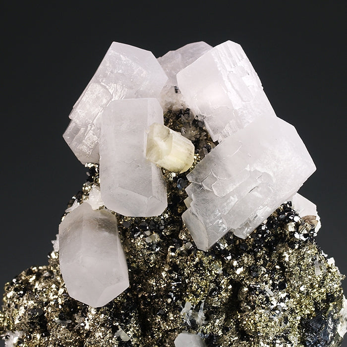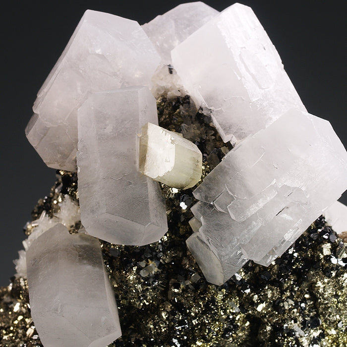 Group of calcite crystals that are arranged in a very aerial manner on a matrix formed by numerous very bright pyrite, chalcopyrite, and sphalerite crystals. Crystals are doubly terminated and show the faces of the hexagonal prism along with those of the negative rhombohedron. Between transparent and translucent. Among them, a well-defined fluorapatite crystal stands out. It is worth highlighting the intense fluorescence that both calcite and fluorapatite present under long-wave ultraviolet light.