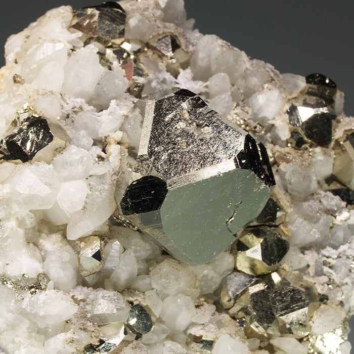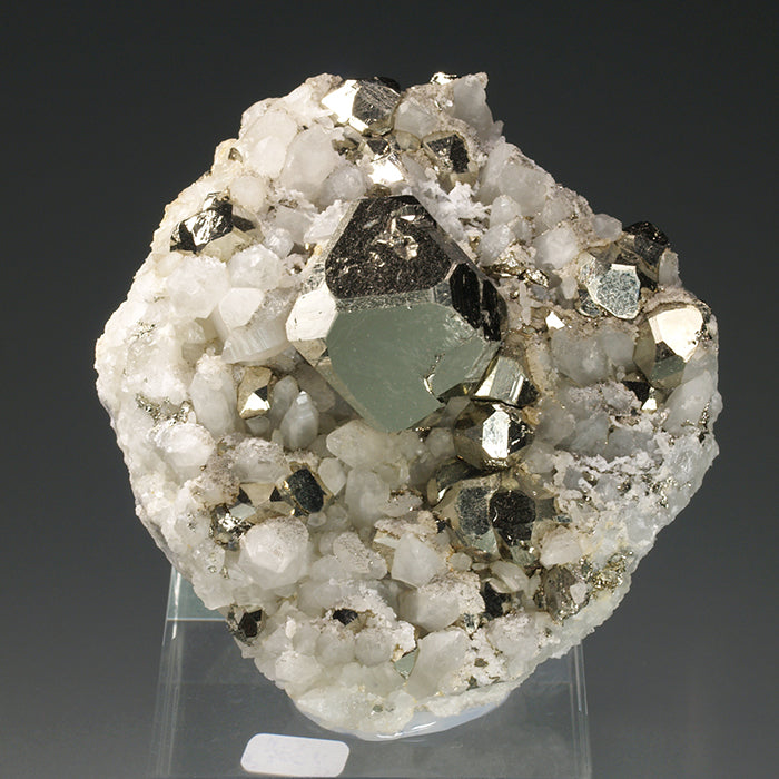 A very remarkable specimen from the collection of Félix Sorhouet (1945-2019) that shows us various octahedral pyrite crystals disposed on a matrix with quartz. Among them, one predominant one stands out, of very good size, with an octahedral habit, beveled edges and truncated vertices. A very interesting specimen for its crystallography and fine aesthetics. The main crystal: 2,6 x 2,4 x 2,3 cm.
