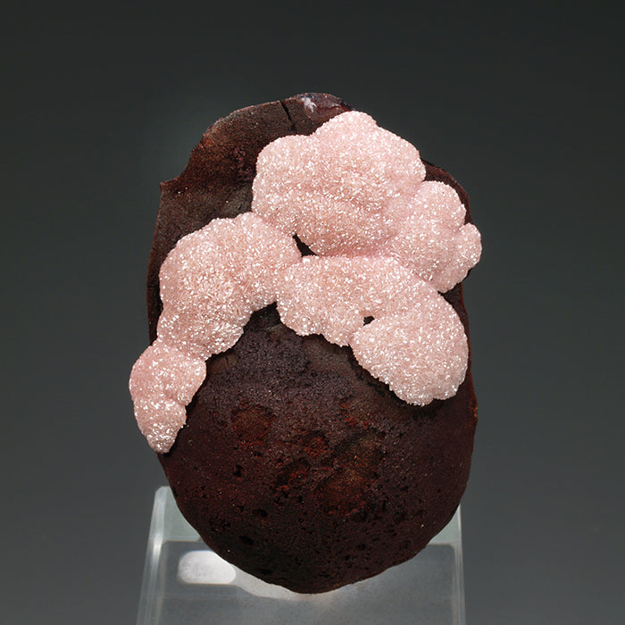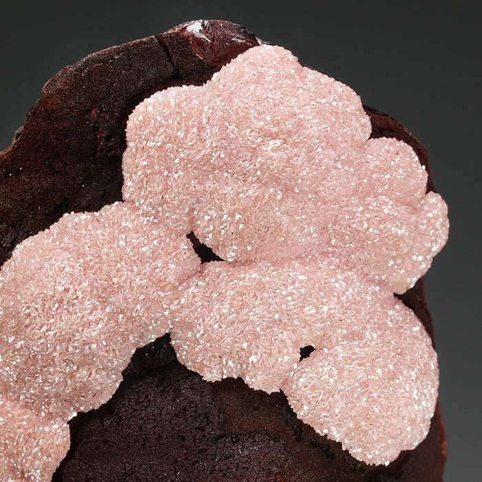 This aesthetic specimen shows several globular aggregates, some of them softly flattened, which are formed by numerous rhombohedral rhodochrosite microcrystals, very brilliant and with a pretty pastel-pink color. They are disposed partially covering a dark matrix, formed mainly by hisingerite, a hydrated trivalent iron silicate that is amorphous or very slightly crystalline and which forms layers. The contrast between the dark matrix and the bright rhodochrosite gives them a very remarkable aesthetic.