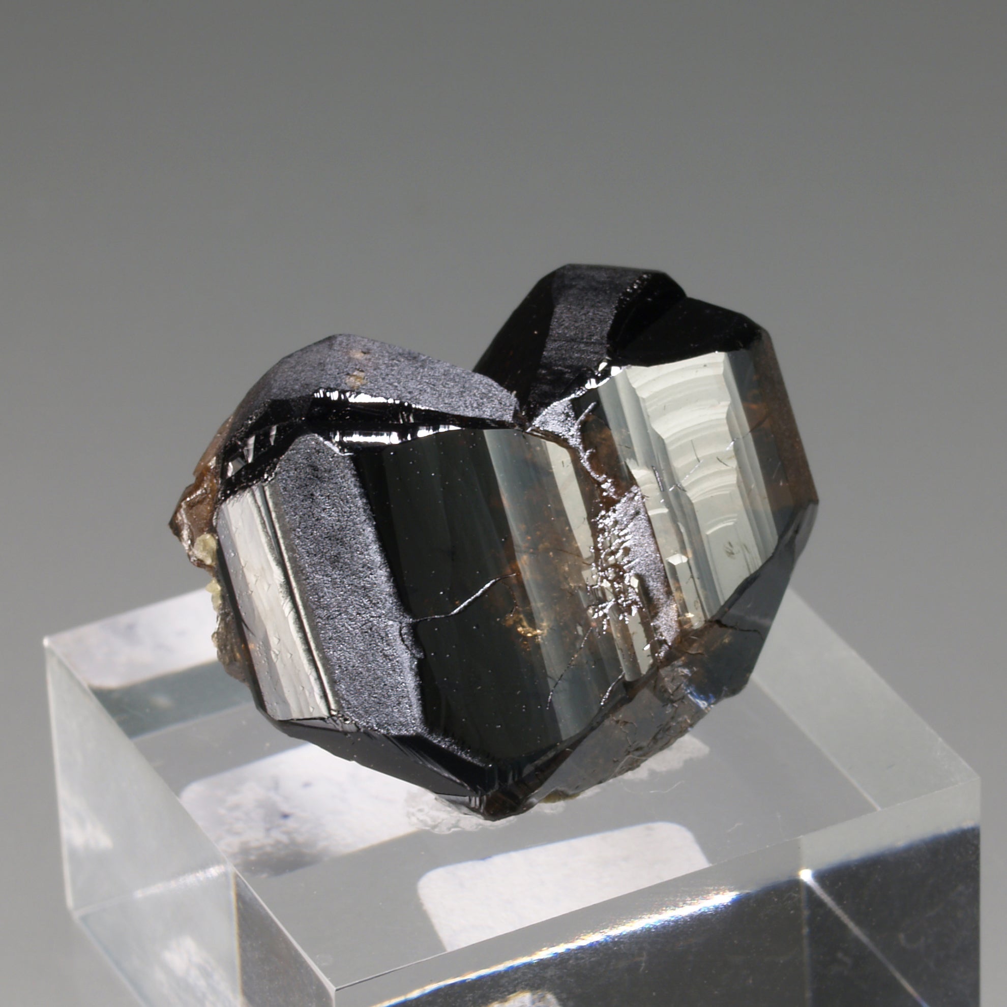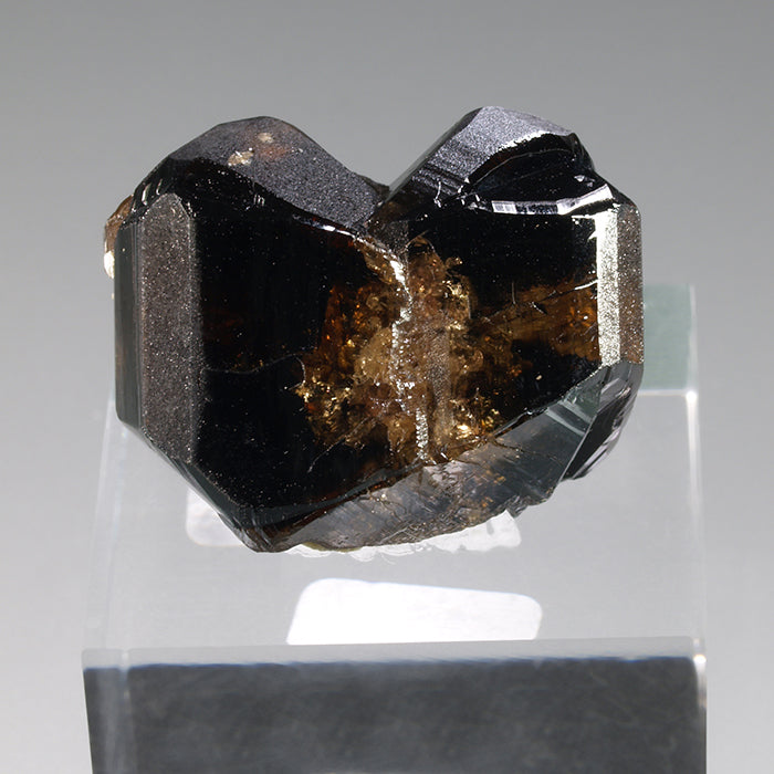 This cassiterite specimen stands out for its exceptional luster, a good transparence that allows us to see the honey interior tones, and shapes reminiscent of an elbow twin. Another interesting sample for crystallography lovers and this classic Portuguese locality collectors.