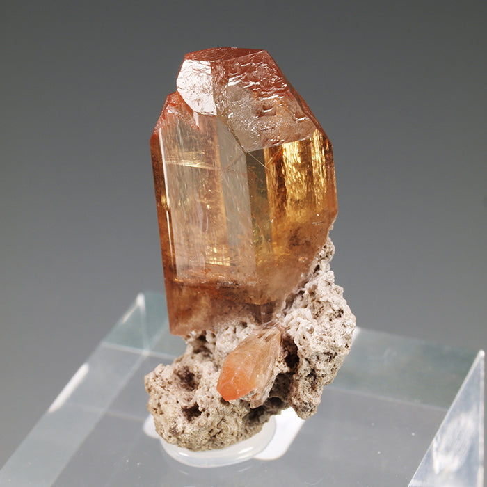 In this miniature, we can enjoy a predominant topaz crystal, richly faceted and with an exceptional transparence. The color is difficult to be defined, as it ranges from orange to pink depending on the incident light. It is accompanied on a matrix by another minor topaz crystal.